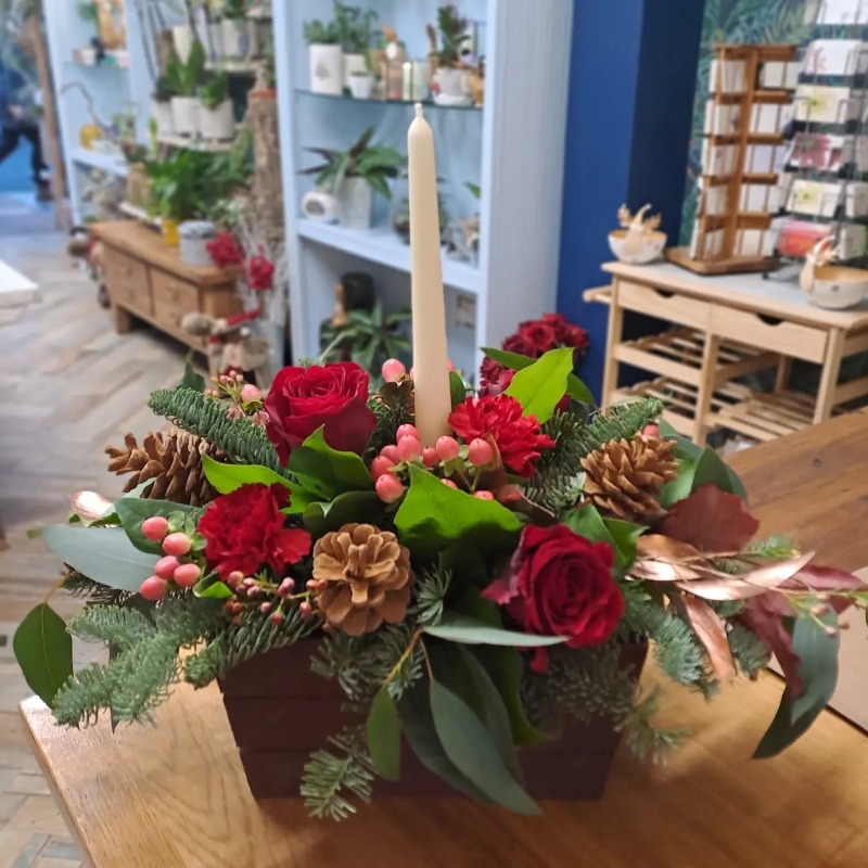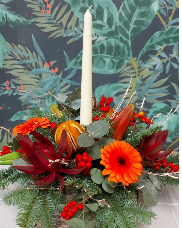 Illuminate your table with our stunning Christmas candle arrangement, featuring fresh flowers and festive accents! Perfect for adding warmth and elegance to your home or as a thoughtful gift.