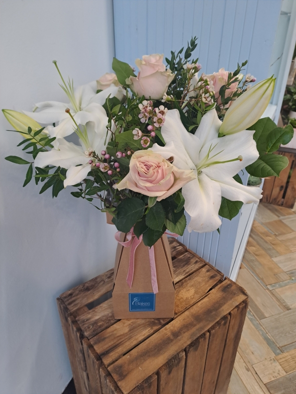 This elegant arrangement features soft pink roses, symbolising admiration and gratitude, paired with pure white lilies that represent commitment and devotion. Perfect for the person who holds your heart, this bouquet blends timeless love with a touch of galaxy-spanning charm, making it the ideal way to say ''I love you'' in a truly unforgettable way.
