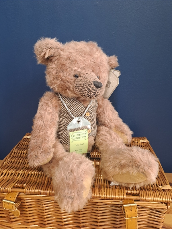 Lily is fully jointed, heavily weighted with beans and wears a waistcoat. An 8 sided hang tag is attached to her left ear and an unique hand numbered Certificate of Authenticity in protective sleeve adorns his neck, No. 469 of 1500. Toby can be recognised as a member of the Silver Tag® Bear family by the exclusive silver fabric tag stitched to her left foot pad.
